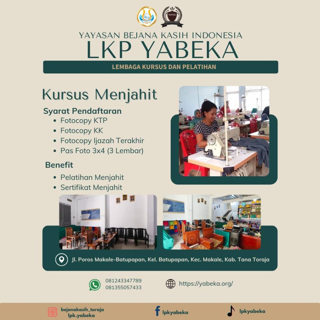 LPK YABEKA membuka pendaftaran program Kursus Menjahit bagi masyarakat yang ingin mempelajari keterampilan menjahit secara profesional. Program ini dirancang bagi pemula maupun yang ingin meningkatkan kemampuan, dengan metode pembelajaran yang mudah dipahami, instruktur berpengalaman, serta fasilitas pelatihan yang memadai.